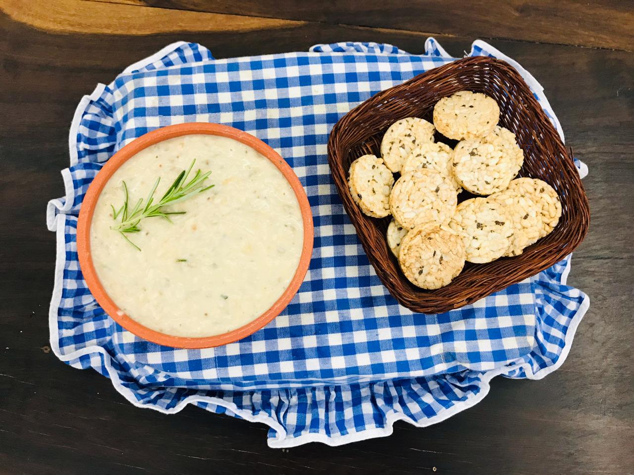 uma cesta com um potê de biscoito de arroz e um pote com patê de feijão