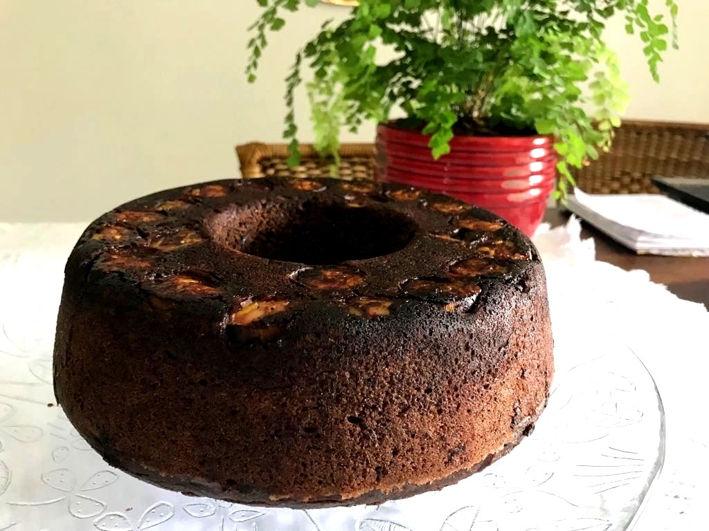 No liquidificador, bati 3 bananas com casca, a água morna e o óleo. Enquanto isso, misturei todos os ingredientes secos numa tigela. Depois, acrescentei a massa do liquidificador. Por último, o bicarbonato e o vinagre de maçã, que vão fazer a função do fermento. Na forma redonda, daquelas com furo no meio, untei com óleo, salpiquei cacau e canela e coloquei rodelinhas de 3 bananas com casca e tudo. Por cima, despejei a massa do bolo. Assei por 55 minutos em fogo baixo.