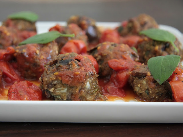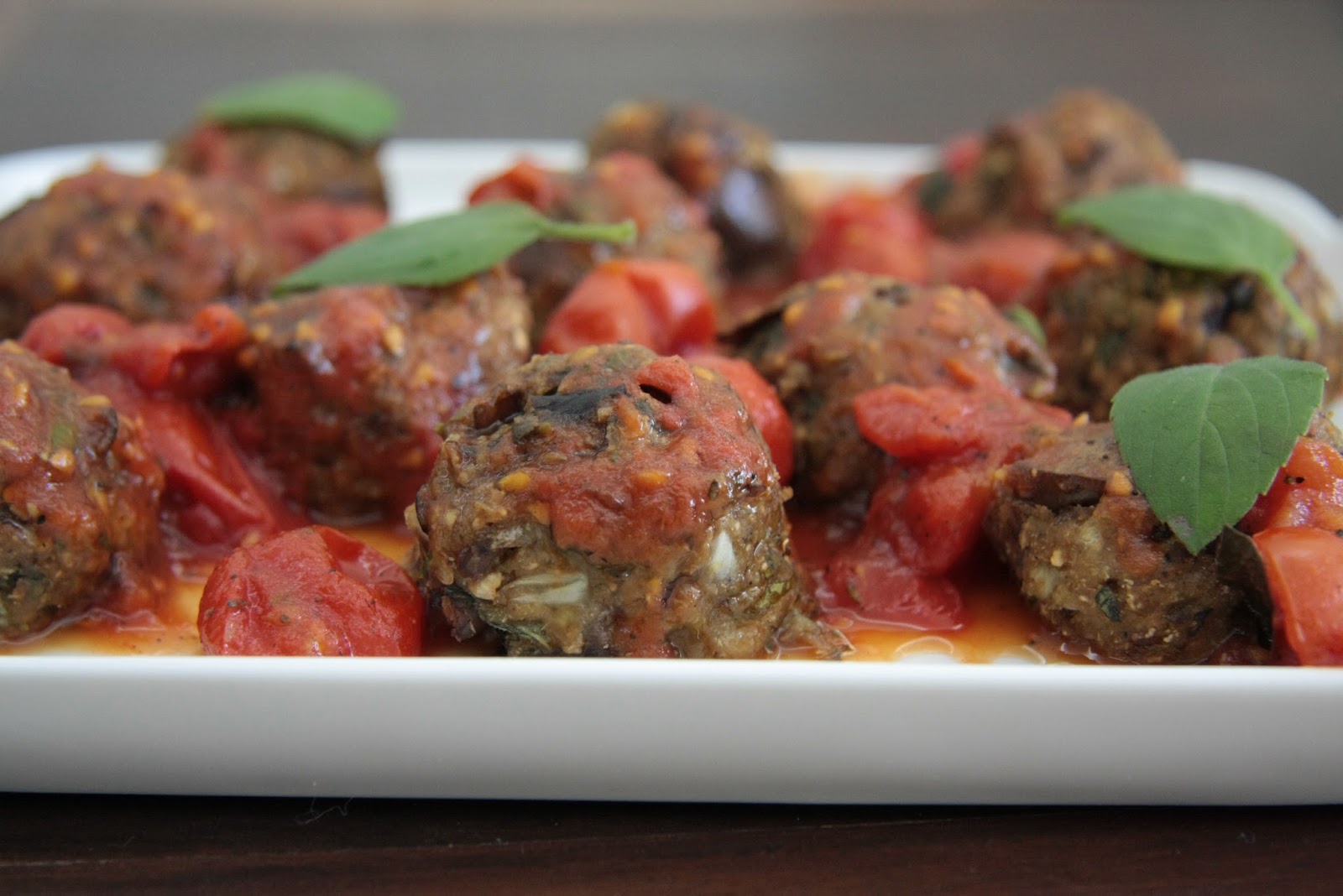 Bati tudo cru no processador, fiz bolinhas pequenas e coloquei numa assadeira untada por 30 minutos. Quem não tiver processador, vai ter que assar a berinjela com a cebola no forno antes, por uns 15 minutos, pra bater mais fácil no liquidificador. Já fiz assim também. Só tem que ter mais paciência. Bater, parar, mexer. Depois de assadas, tiro as almôndegas do forno e jogo o molho de tomate (que esquentei numa panela) por cima. Finalizo com manjericão fresco.