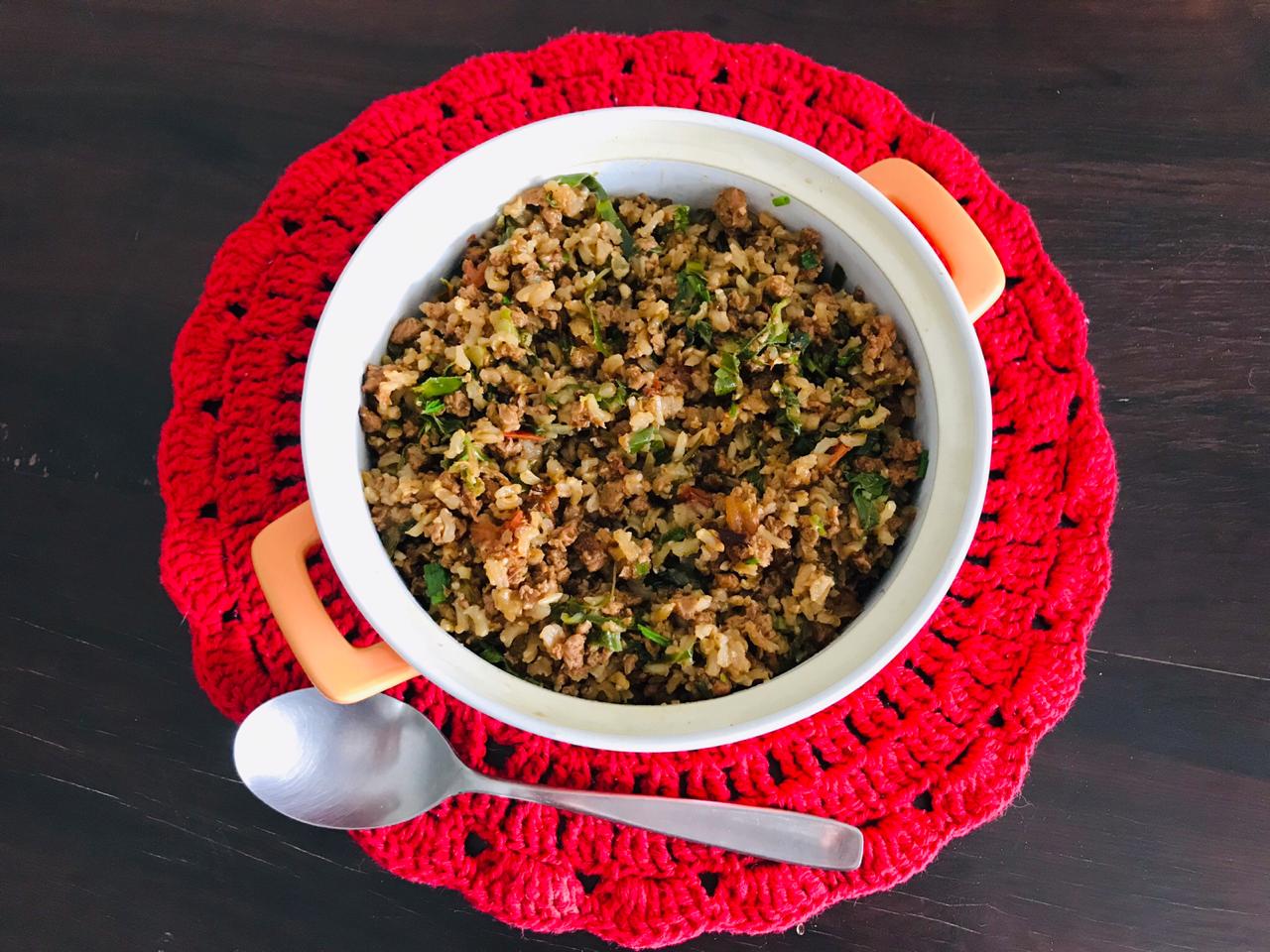 Aqui em casa a gente comeu assim purinho no almoço e depois como recheio das folhas de repolho e molho de tomate.