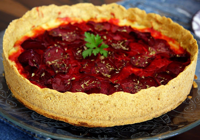 →Depois é só tirar a fôrma com a massa pré-cozida do forno, jogar o recheio, e colocar as camadas de beterraba por cima. Eu coloquei uma camada de beterraba, depois a cebola em rodelas por cima, sal e pimenta e em seguida mais uma camada de beterraba. Aí é só devolver no forno por mais uns 20 minutos.